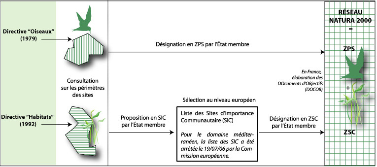 Pour la mise en place du réseau Natura 2000, deux dispositifs fondamentaux ont été instaurés : les directives "Oiseaux" et "Habitats-Faune-Flore".